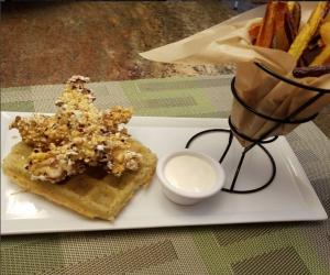 Home/Recipes/Chicken/Popcorn Chicken over Rice Waffles, Colored Carrot Fries, and Truffle Mayo