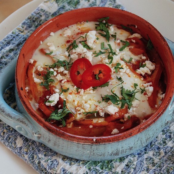Baked Shakshuka topped with Chopped Parsley and Feta Cheese