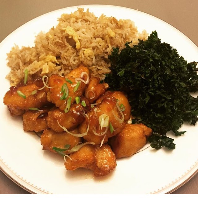 Sweet and Sour Chicken served with Egg Fried Rice and Seaweed