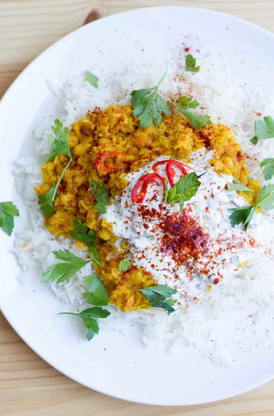 Home/Recipes/Side Dishes/Spicy Red Lentil Dahl with Mint Yogurt