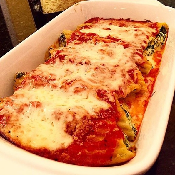 Manicotti, filled with Ricotta and Spinach, topped with mozzarella cheese.