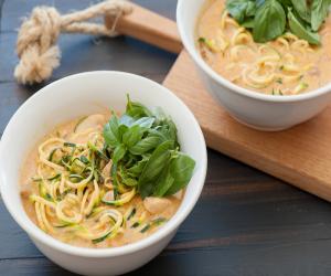 Zoodles in a Roasted Red Pepper and Tomato Sauce and a Sunny Side Up Egg