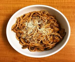Whole Wheat Spaghetti in Garlic Flavored Tomato Sauce with Mushrooms.